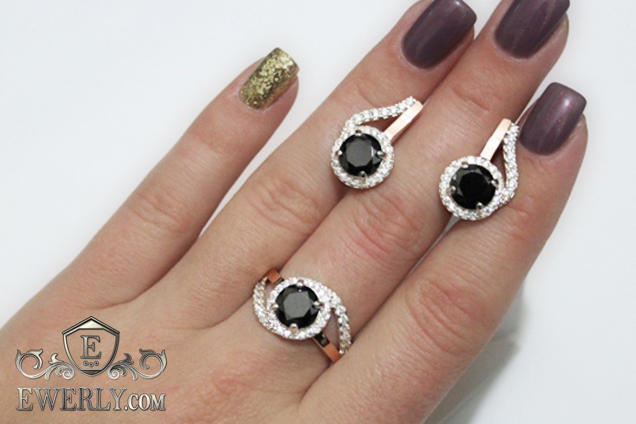 Жіночі срібні кільце і сережки з золотом і з чорними каменями