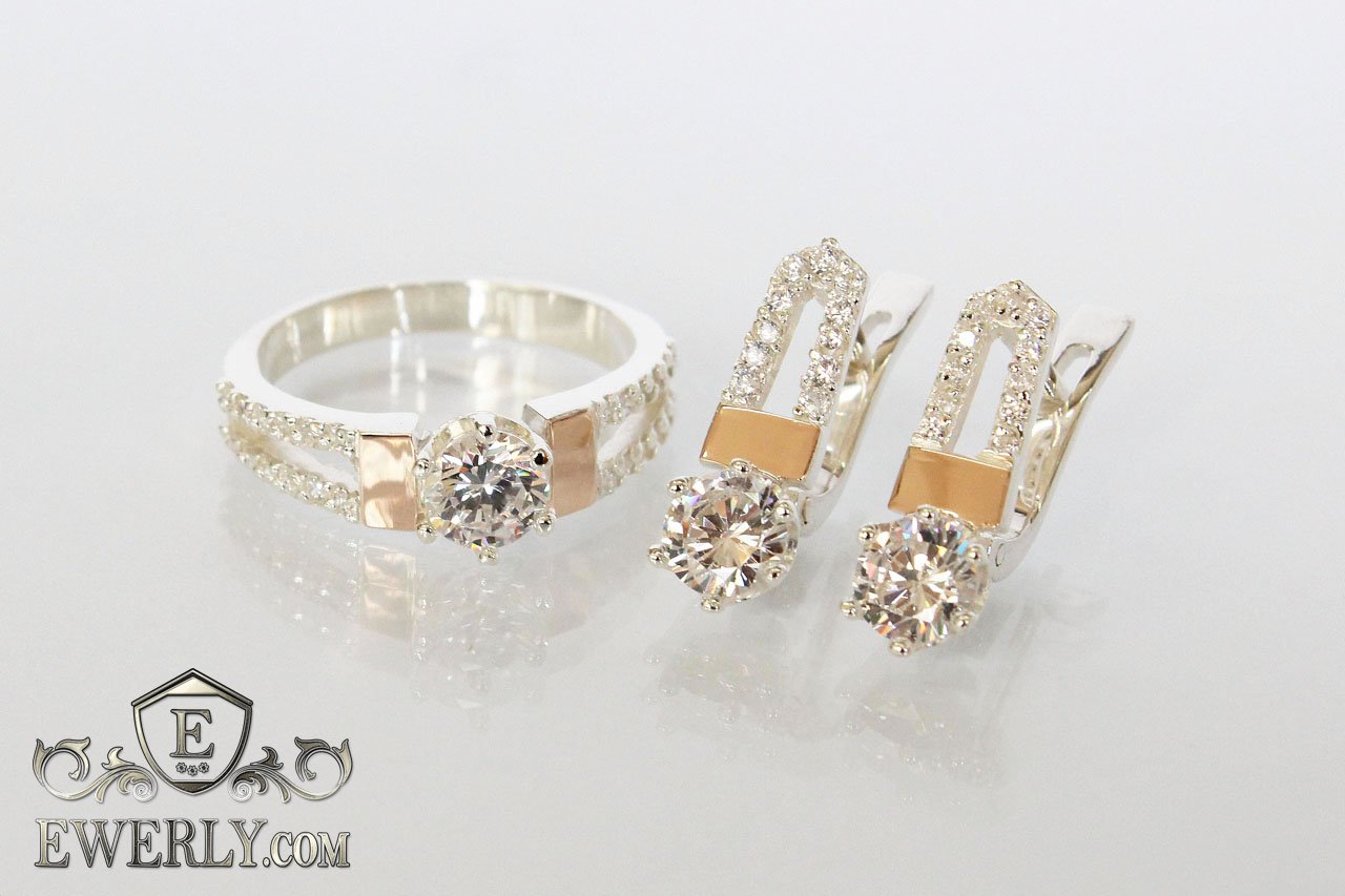 Кільце і сережки із срібла з білими каменями і золотом