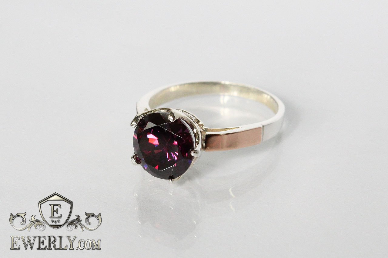 Срібне жіноче кільце з золотими вставками і фіанитом (колір - аметист)